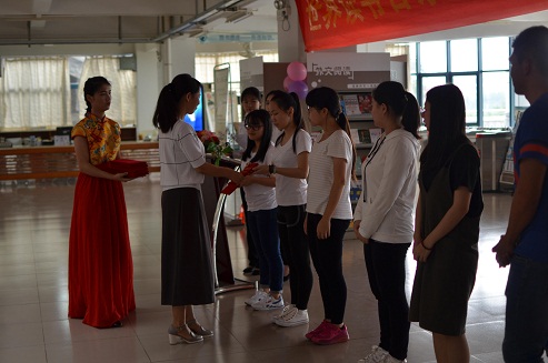 活动第四项流程是捐书仪式,唐永红副主任代表法公系捐赠图书,谢曼馆长代表图书馆接受法公系捐赠的图书。