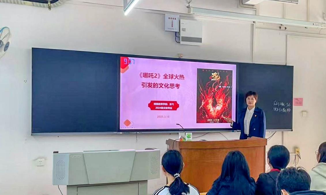 为通过跨文化传播构建人类命运共同体意识,促进不同文化之间的交流与合作,2025年3月19日早上,博雅教育学院(应用法学与公共事业学院合署)副院长张弋在一教313以“《哪吒2》全球火热引发的文化思考”为主题讲授了2025年春季学期“第一堂思政课”