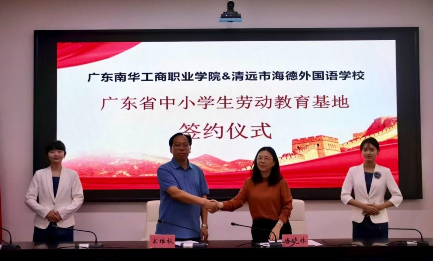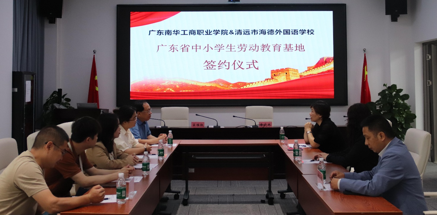 2025年4月18日上午,广东南华工商职业学院与清远市海德外国语学校劳动教育基地签约仪式正式举行。仪式由博雅教育学院副院长张弋主持,清远市海德外国语学校副校长宋维权、广东南华工商职业学院副校长唐晓林出席会议,共启劳动教育合作新篇。
