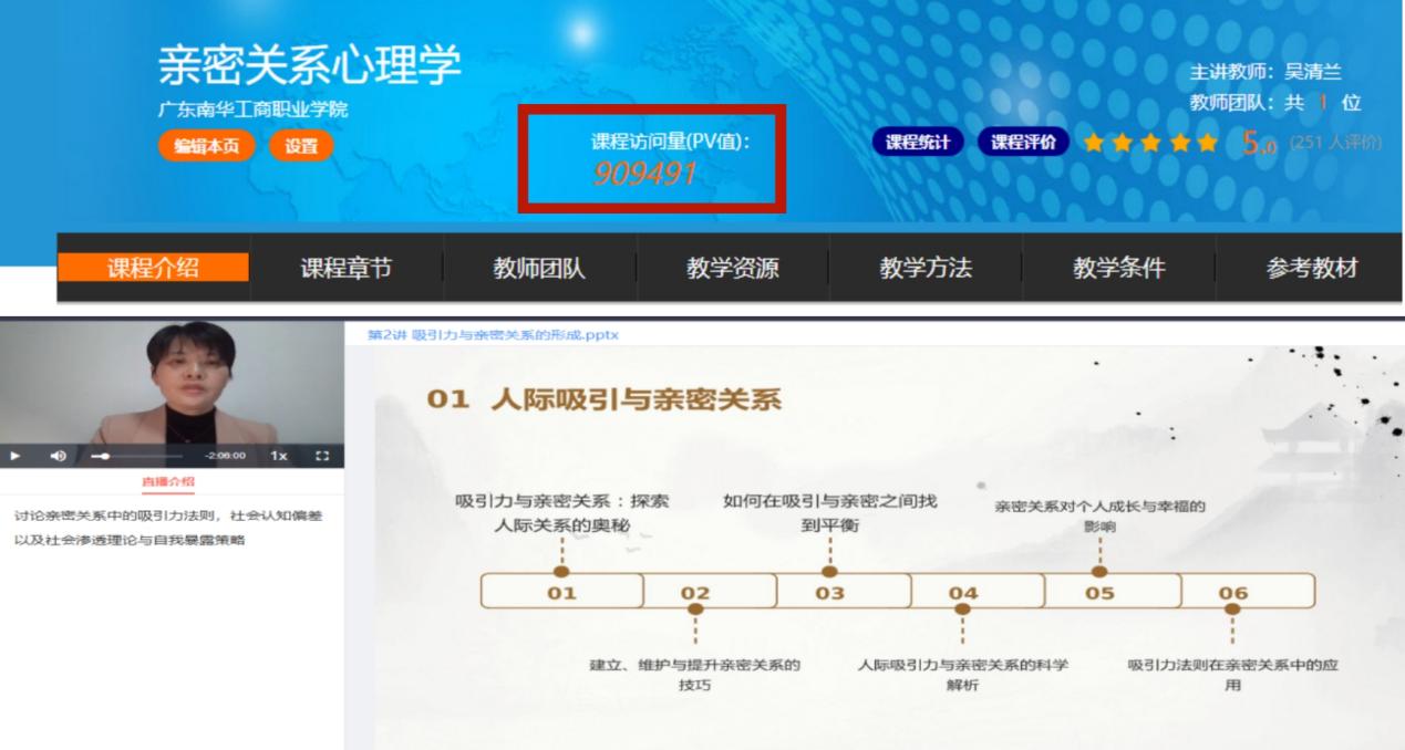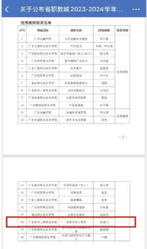 近日,广东省职教城2024-2025学年第一学期校际互选课程评选结果正式公布,我院吴清兰副教授主讲的《亲密关系心理学》课程,凭借其创新的教学模式、广泛的学生影响力及扎实的育人成效,荣获“校际互选课程优秀教师”称号。