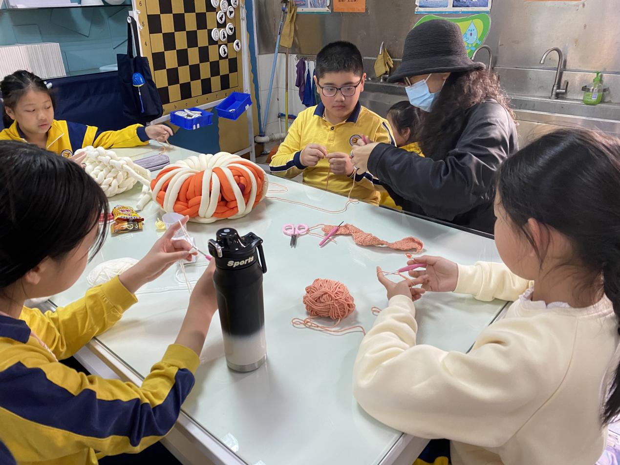 孩子们专注练习,在穿针引线间熟练技巧,将自己的奇思妙想融入编织中。彩色毛线在指尖跳跃,零散的毛线变成了小巧的花瓣、可爱的玩偶帽等充满童趣的作品。孩子们兴奋地展示成果,课堂上洋溢着欢声笑语,传统技艺也在他们手中焕发出崭新生机。
