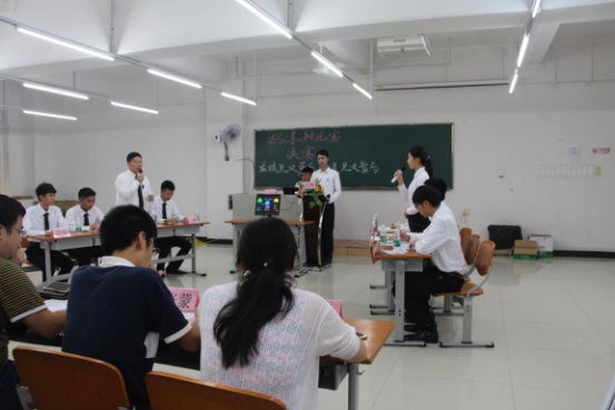 2016年10月9日下午15:00,第三届辩论赛初赛在教学楼507和510课室同时进行。首先由主席介绍出席的各位评委和双方辩手,然后主席宣读本次比赛的注意事项和介绍辩论流程,分别是陈词阶段、攻辩环节、自由辩论、总结陈词四个环节。紧张的辩论赛便拉开了帷幕,每位队员都使尽了浑身解数,努力应战,比赛现场可谓如火如荼,场面激烈。比赛现场浓郁的气氛,台下的亲友团热情高涨,掌声不断,积极参与提问环节,更是展现了本次比赛的高质量。评委们也为每支队伍做出了精彩的点评,指出双方的不足之处,也强调在今后辩论赛要注意的地方。