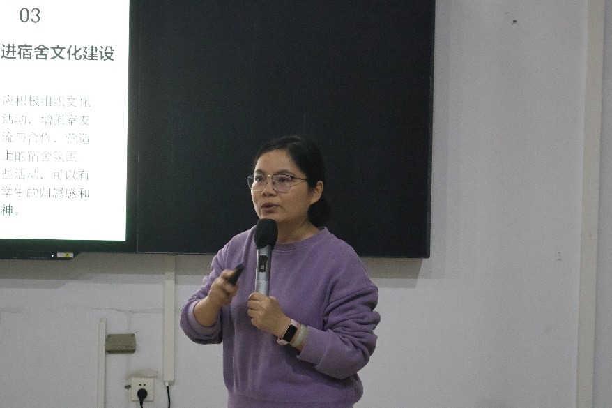 张文娟老师由当前学生心理问题现状引入,突出心理委员及宿舍心理观察员的重要性,强调良好的宿舍氛围对学生的心理健康有促进作用,面对冲突时,宿舍长应采取多种策略进行调解,同时保持中立态度,以促进双方的和解和宿舍内的和谐。并重点从关注对象、危机识别、开展帮扶等方面向同学们传授了大学生心理问题的应对方法,以及预防心理问题的方法。例如,学生们可以建立健康的生活习惯、学习压力管理技巧、培养积极的人际关系、提高自我认知能力等。
