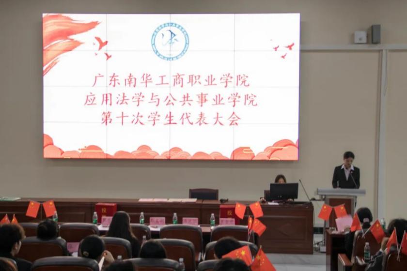应用法学与公共事业学院于2024年6月14日13时在清远校区教学楼101召开我院第十次学生代表大会,本次大会共有52名学生代表参加,学院分管学生工作副院长刘爱玲老师、学院学生工作办公室主任张文娟老师、学院团委书记汤泳怡老师、学院团委副书记兼学生会指导老师袁金苑老师、学院团委副书记郭依菁老师参加此次大会。