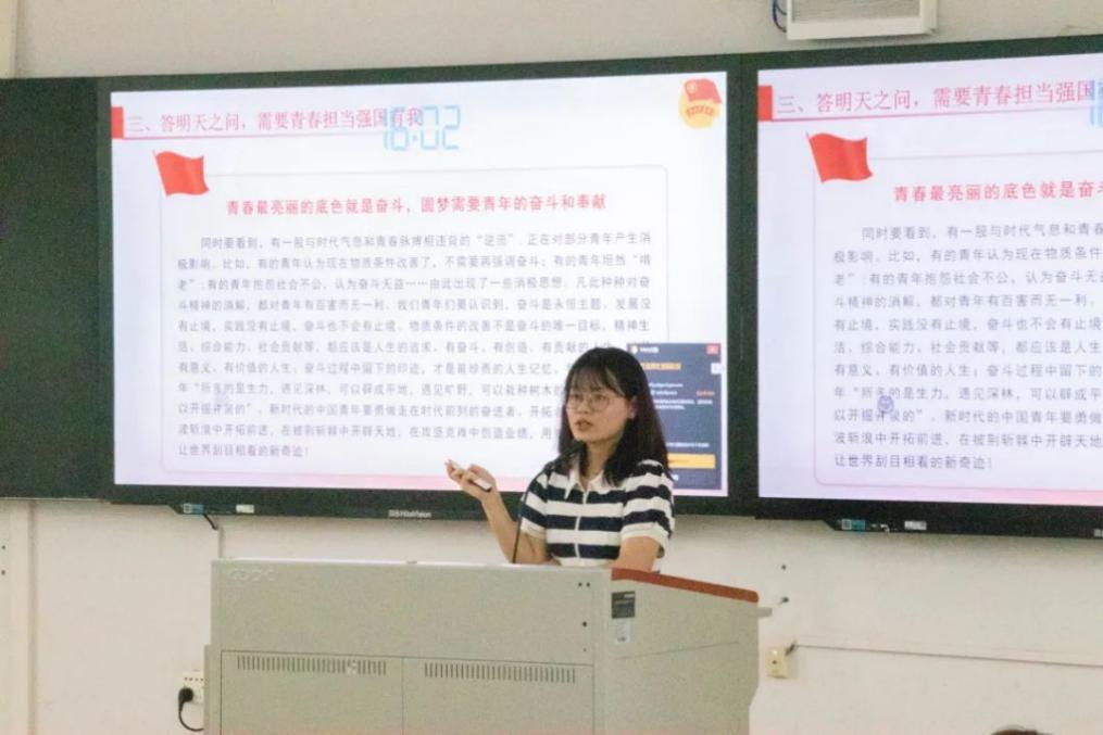 在回忆复兴伟业当中,郭依菁老师还巧妙地将历史与现实相结合,通过“一代人有一代的长征,一代人有一代人的担当”这一深刻论述,引领同学们回顾了中华民族复兴的壮丽征程。她指出,从新民主主义革命时期“救国的一代青年”的英勇斗争,到社会主义革命和建设时期“建国的一代青年”的辛勤付出,再到当前“强国一代的中国青年”在科技创新、乡村振兴、绿色发展、社会服务、卫国戍边等领域的广泛参与,每一代青年都以其独特的方式书写着属于时代的华章。