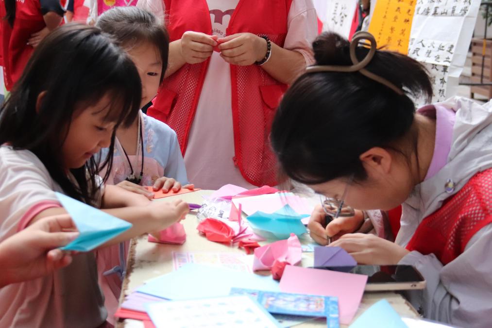 活动现场,折纸 DIY 趣玩摊位前人头攒动,小朋友们和家长们满怀期待。志愿者们从折纸基础步骤入手,通过耐心演示和手把手教学,带领小朋友们和家长将一张张彩纸变成栩栩如生的小动物、精巧的花朵。教学过程中,志愿者兼顾现场秩序维护,引导大家有序参与。现场欢声笑语不断,邻里间相互交流折纸技巧,其乐融融。