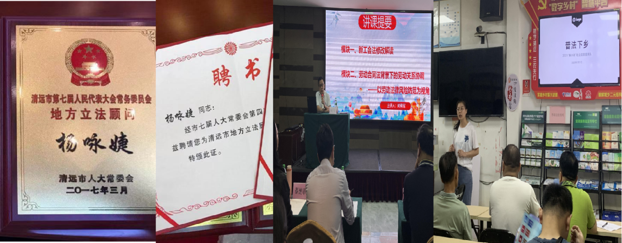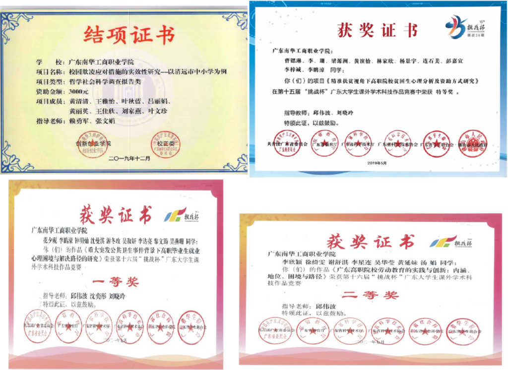 专业学生积极参加省市级竞赛屡获殊荣,获2019年第十五届“挑战杯”大赛特等奖、2017年第14届挑战杯省赛一等奖、2018年广东省共青团十九大精神学习心得体会征文一等奖、2018年第七届全国高校模拟集体谈判大赛资方一等奖和劳方三等奖、2021年第十六届挑战杯省赛一等奖、2017年挑战杯-彩虹人生省赛二等奖2个、荣获2018“中科杯·勇往直前·大学生就业技能与知识竞赛二等奖、2021年第十六届挑战杯省赛二等奖、2018年挑战杯-创青春省赛铜奖、2019年广东省第五届互联网+青红赛道优胜奖。2018年第七届全国高校模拟谈判大赛获资方一等奖、劳方三等奖,2023年第十一届全国高校模拟谈判大赛获其实劳方二等奖、资方三等奖。共有市厅级科研立项4项,省级科研立项3项。专业教师积极参加社会实践和社会服务,具有较强的社会服务能力,被清远市人大常委会聘请为地方立法顾问。
