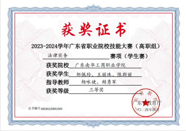 11.2024年4月法律事务专业学生徐泽娜、获得2023年-2024年度广东省职业院校技能大赛学生专业技能竞赛法律实务赛项(高职组)三等奖。