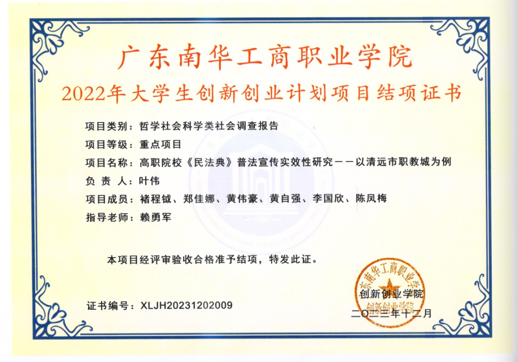 9.2023年12月,法律事务专业学生叶伟、褚程钺、郑佳娜、黄伟豪、黄自强的2022年大学生创新创业计划项目《高职院校<民法典>普法宣传实效性研究--以清远市职教城为例》结项。