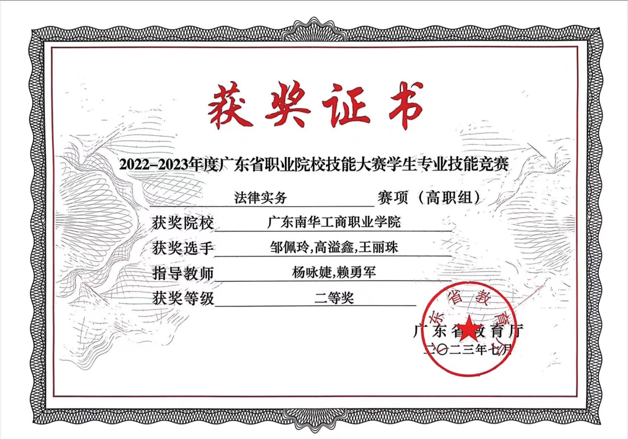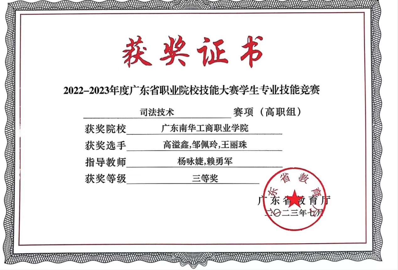 2.2023年7月法律事务专业学生邹佩玲、高溢鑫、王丽珠获得2022年-2023年度广东省职业院校技能大赛学生专业技能竞赛法律实务赛项(高职组)二等奖、司法技术赛项(高职组)三等奖。