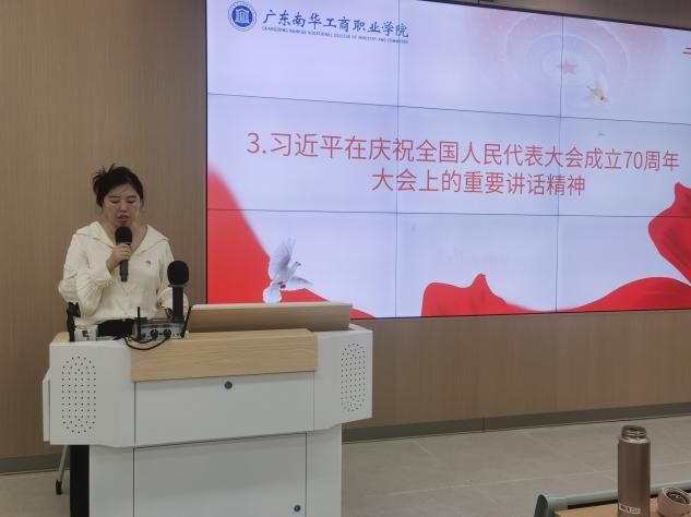 院长助理董芳带领大家学习了党的二十届三中全会会议精神,党总支部组织委员刘丽分享了关于习近平庆祝全国人民代表大会成立70周年的讲话精神。