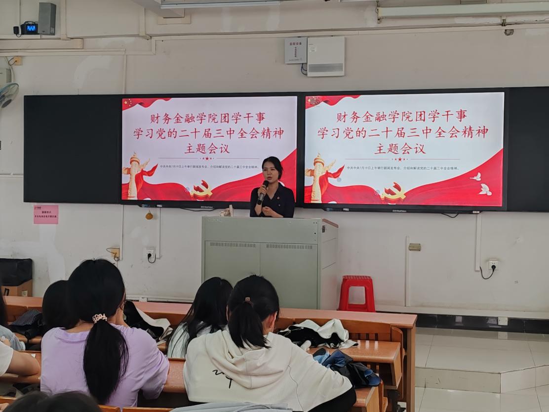 2024年9月24、25日,财务金融学院团委分别在天河校区、清远校区开展党的二十届三中全会精神专题学习会。财金学院团委书记杨力铖和团委副书记郑颖钧担任主讲,2022、2023级团学干部参与学习。