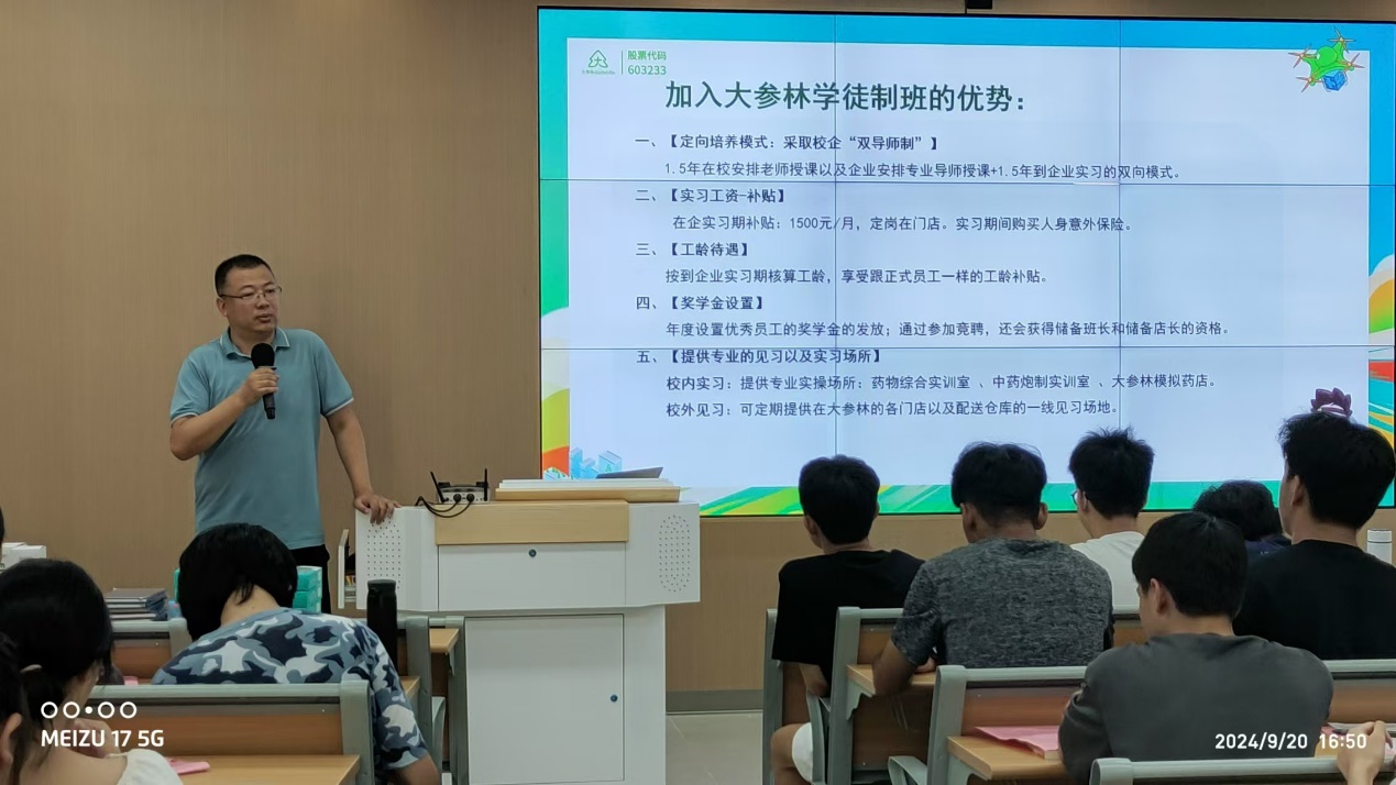 2024年9月20日,财务金融学院联合清远大参林连锁药店有限公司在清远校区举行药品经营与管理专业大参林现代学徒制宣讲会。宣讲会由药品专业负责人王有志主持。