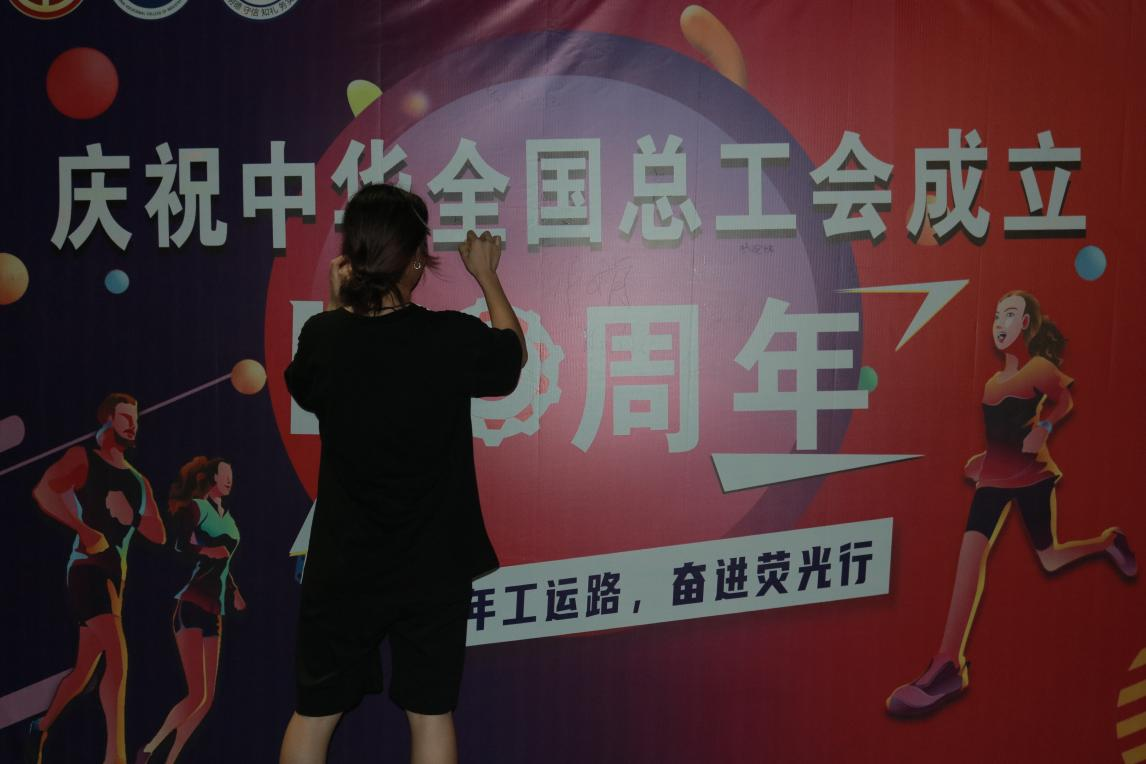 当跑步的最后一个脚步落在终点,本次活动也步入尾声,师生们有序来到签名墙前,写下对中华全国总工会的美好祝愿,“祝工会百年辉煌,照亮劳动之路”“愿工运精神永远闪耀”等祝福语接连出现。签名墙前师生们共同合影,相机闪光灯不断闪烁,欢笑声此起彼伏,为此次活动留下美好回忆。