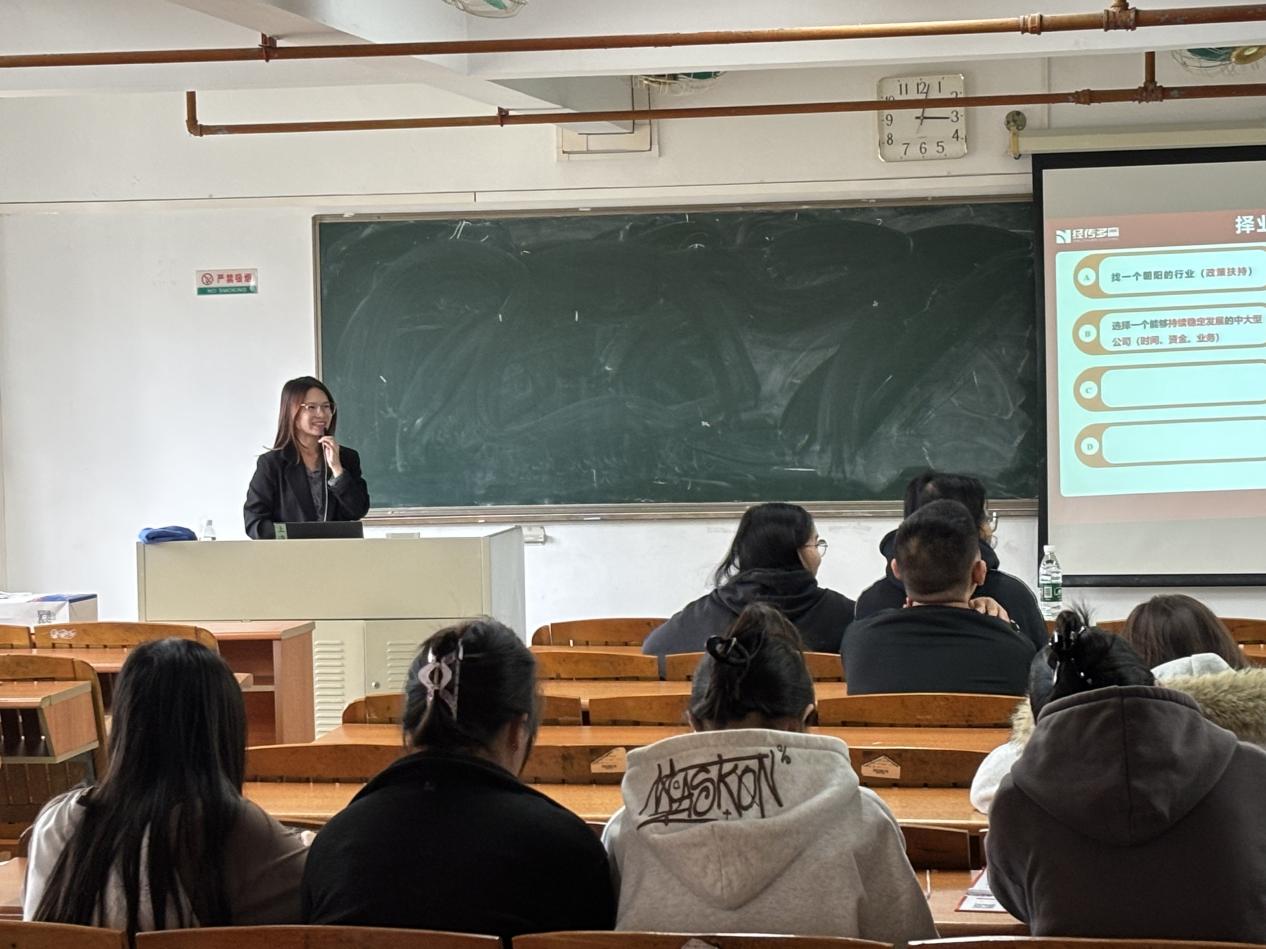 宣讲会上,经传多赢招聘负责人首先从企业背景切入,系统介绍了公司作为投资咨询服务机构,在金融数据服务、智能投顾工具研发及投资者教育领域的业务布局与发展成果,并结合数字经济时代金融行业的转型趋势,重点讲解了公司对复合型技术技能人才的迫切需求。随后,负责人详细解读了本次校招开放的“证券实习生”“投资顾问助理”等岗位的职责要求、能力素养标准及职业发展通道,特别强调“技术应用能力+行业理解深度”的复合能力模型,鼓励学生将课堂所学与行业实践紧密结合。