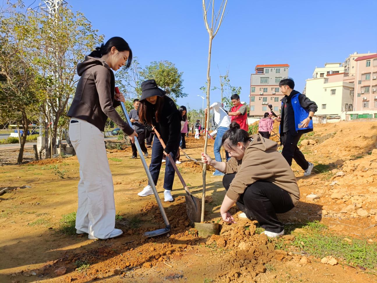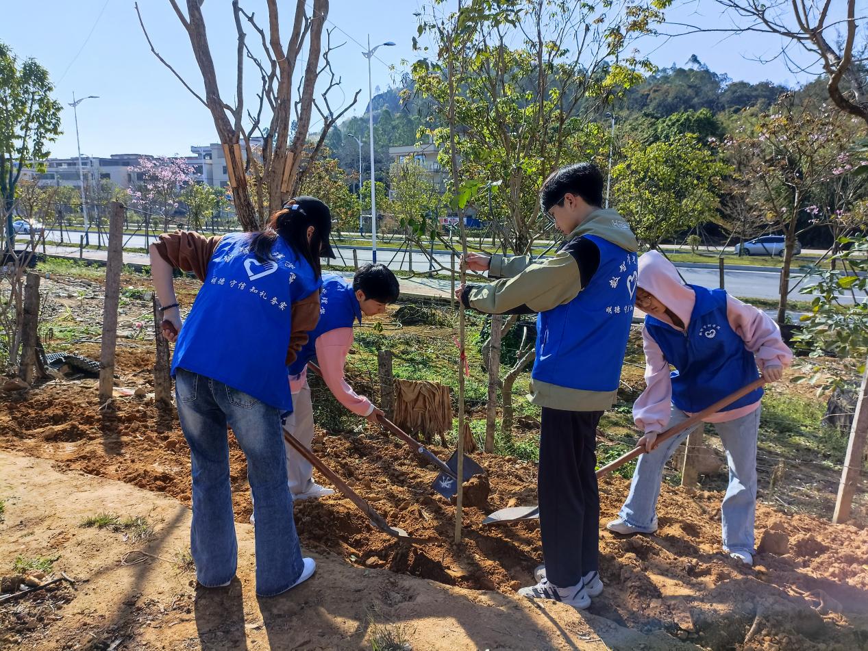 3月12日,数智管理学院学生党支部在清远东城街道长埔村开展3月植树节主题党日活动。院党总支书记胡娟、学生党支部全体教师及学生党员参加了此次植树活动。