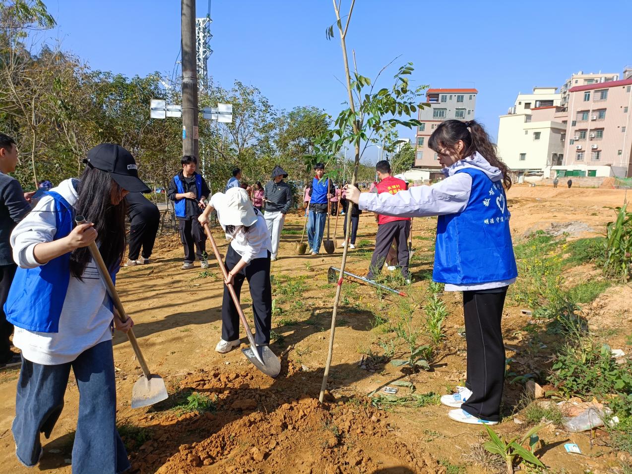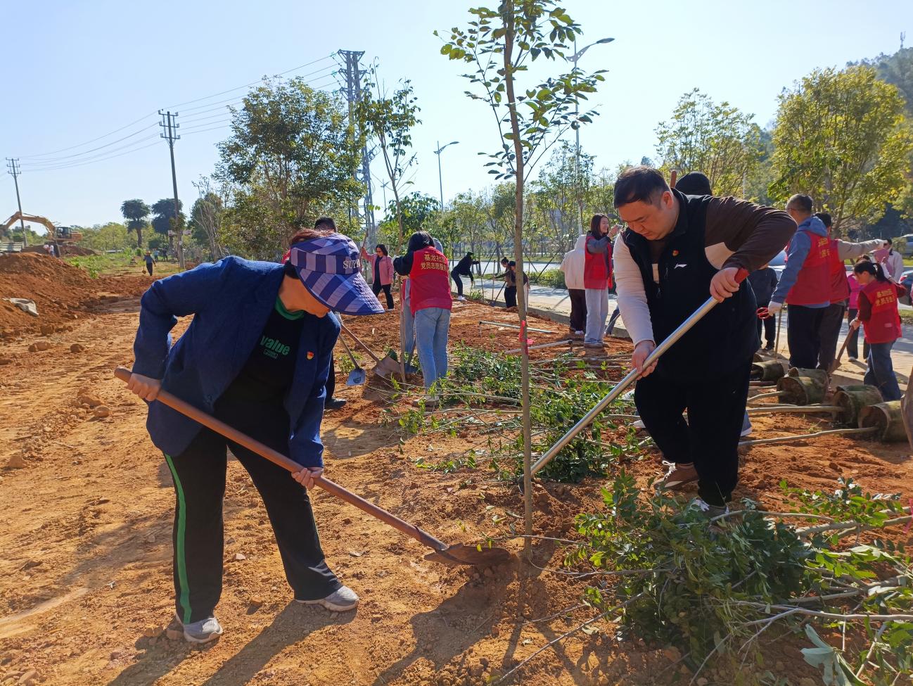 活动当天,全体党员齐聚长埔村,在党总支书记胡娟的带领下,大家分工协作、配合默契,有的挖坑、有的扶苗、有的填土、有的浇水,现场呈现出一派热火朝天的劳动景象。经过数小时的辛勤劳作,一棵棵新栽的树苗迎风挺立,为春日的大地增添了一抹新绿。