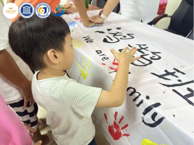 (孩子们一起在旗帜上印下手印)