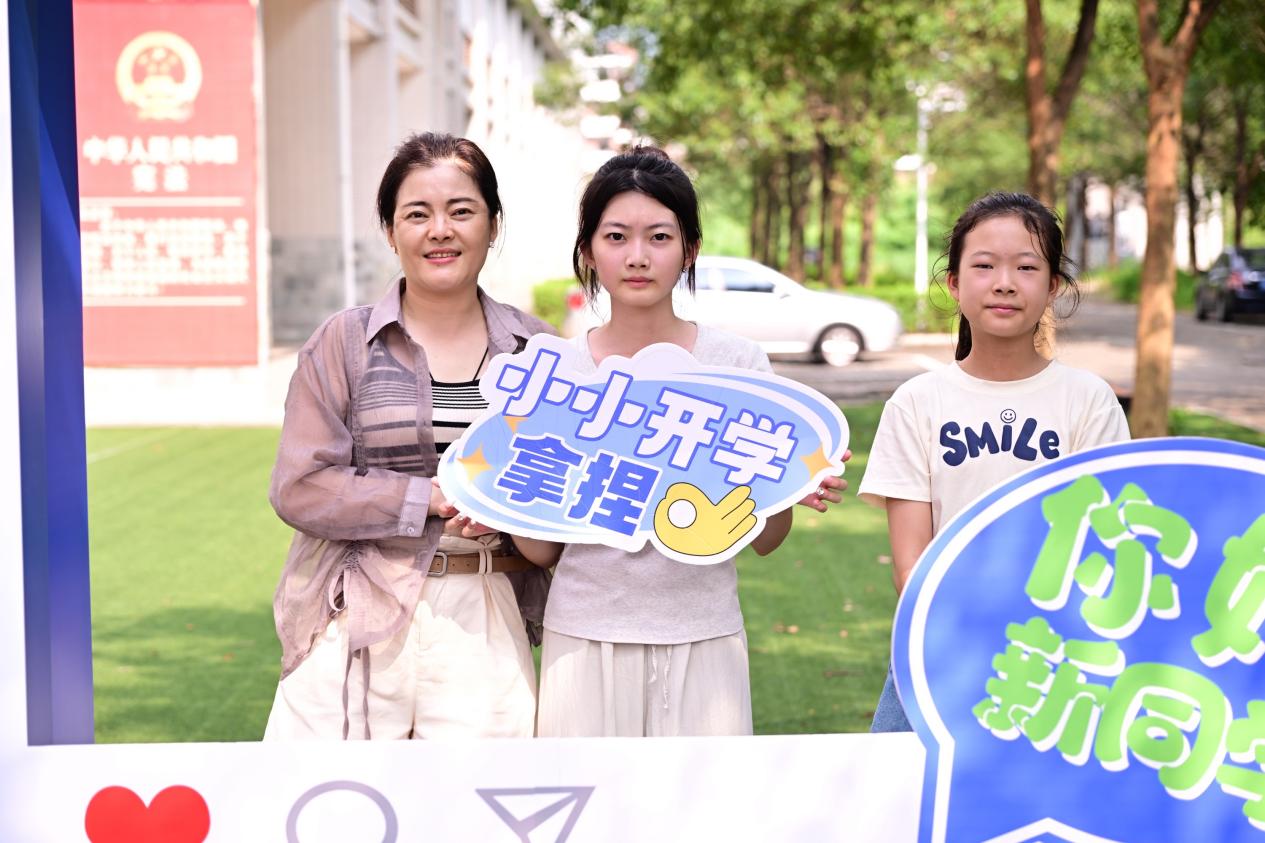 (学生志愿者在校门口迎接新生)