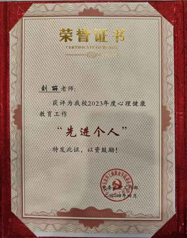 图 2 副站长刘丽老师获2023年度心理健康教育工作先进个人
