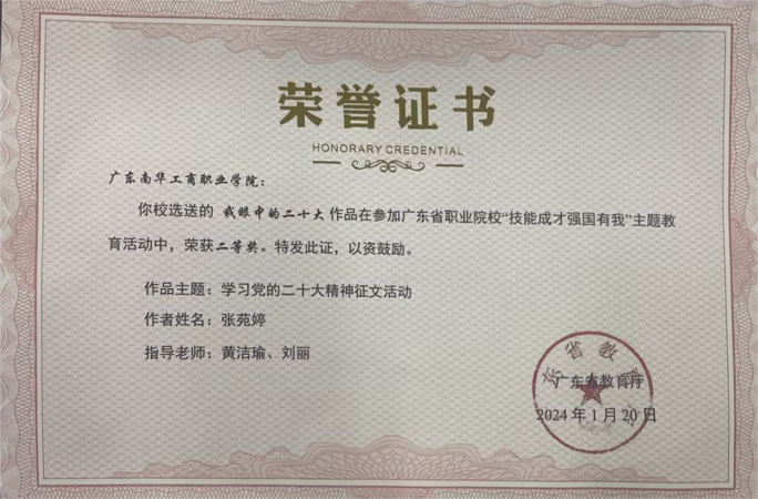 广东省教育厅2023年职业院校“技能成才,强国有我”系列教育活动二等奖 |