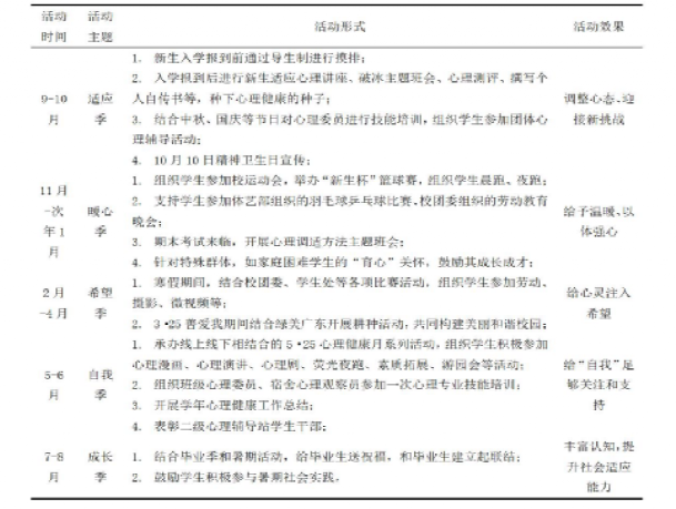 1.开展形式多样的心理健康教育、宣传活动,包括活动日(周或月),专题讲座,新生适应性教育,开展团体辅导等