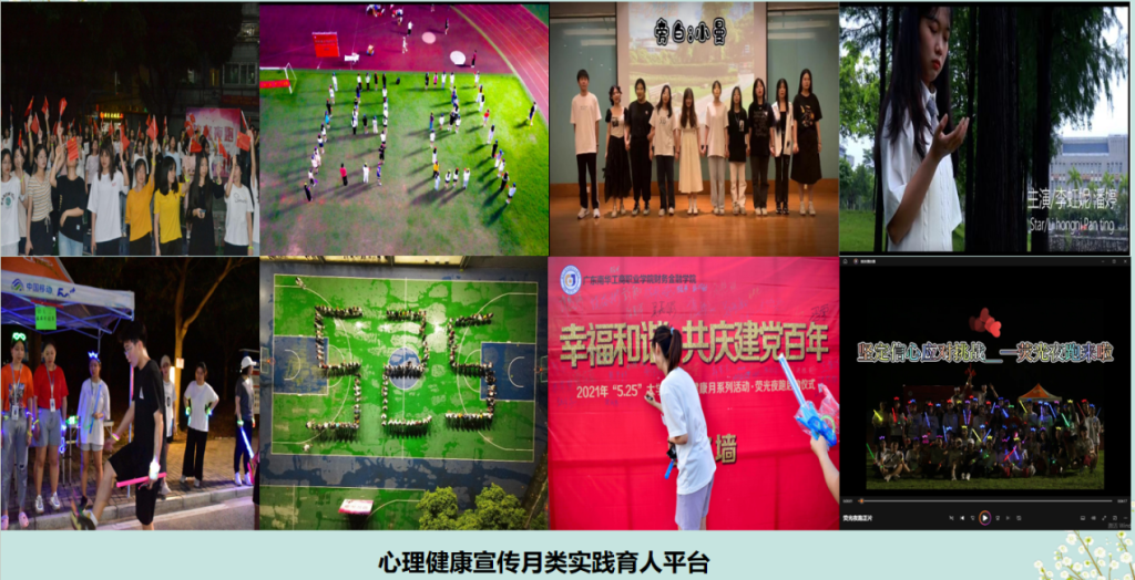 心理健康宣传月类实践育人平台:精品活动路径。学院、班级、宿舍开展多样化的心理实践活动,包括心理剧、观看心理电影、心理知识竞赛、心理沙龙、心理微电影、心理驿站、心理主题班会、心理素质拓展、荧光夜跑、社会实践等一系列活动,每年参与人数达万余人,营造了积极向上校园文化氛围。