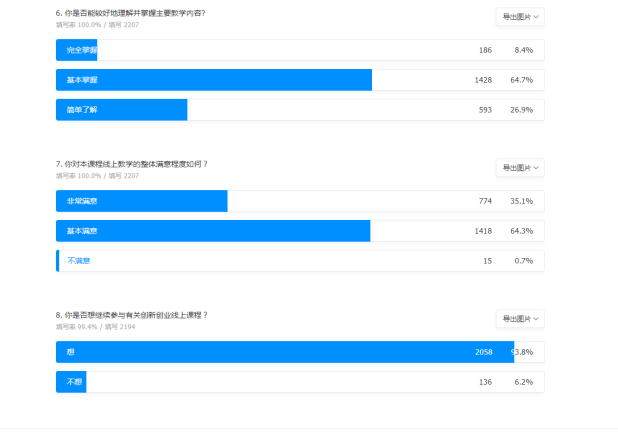 直播课开展期间适逢清明节假期,但师生参与度极高。据统计,整个直播课程参与人次近6000人,最高时有1700多人同时在线学习。本次直播课进行了满意度调查,共收集到有效问卷5916份。大部分同学认为课程内容难度适中,能够基本掌握讲授内容。有5904人认为授课老师讲解通俗易懂,生动形象,课上互动频繁,能够很好的理解课程内容。有5879名同学认为此次课程对自己非常有帮助,能够很好的对自己项目进行打磨,了解自身项目不足之处。学生们纷纷表示希望学校能够继续开设相关课程。