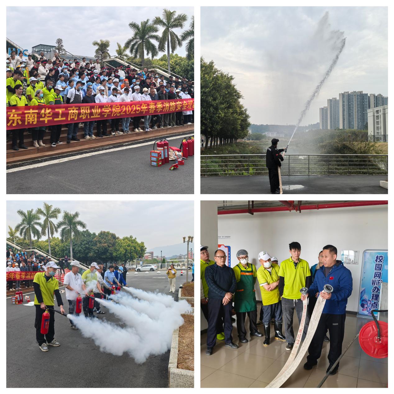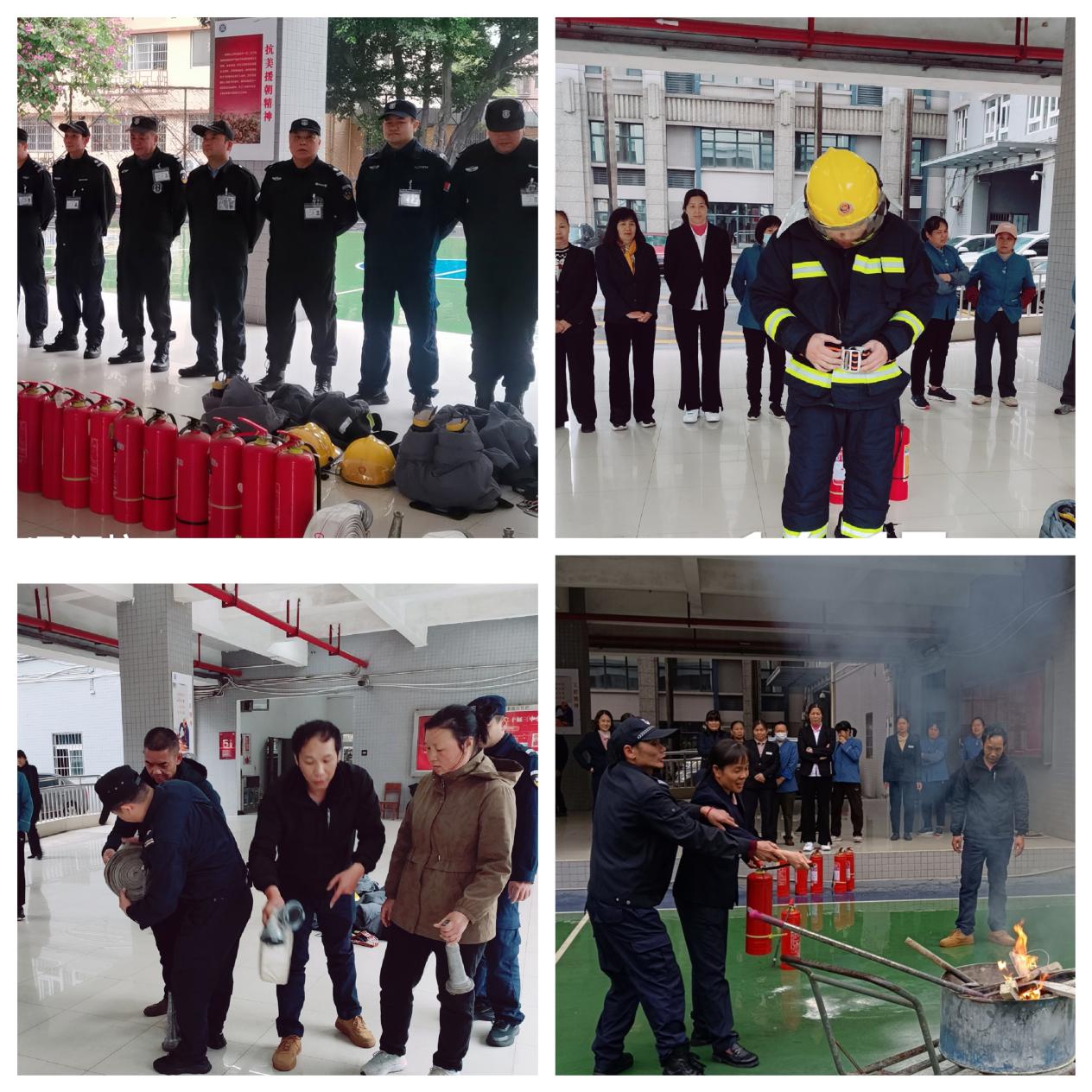 现场演示了灭火器、灭火毯、防毒面罩、消火栓等常见消防器材的正确使用方法,包括如何检查器材是否完好有效、如何正确操作灭火等。后勤人员们积极参与,纷纷上手体验,在保卫处和物业的指导下,开展灭火实战演练,掌握了灭火器和消火栓的使用技巧。