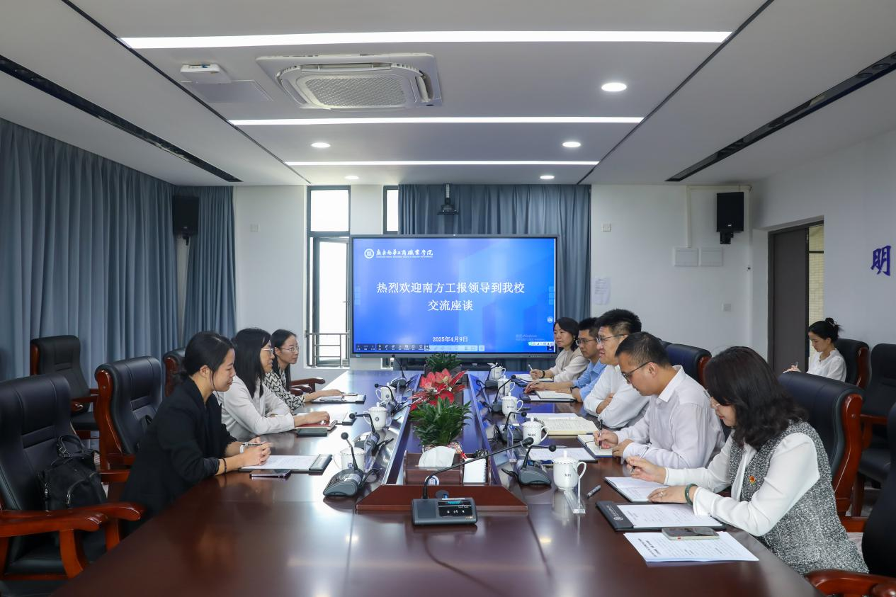 4月9日,广东南方工报传媒有限公司党支部书记、副董事长、总编辑张英姿一行到我校调研交流,学校党委书记、校长林海参加调研座谈,并代表学校对南方工报的到来表示了热烈的欢迎。
