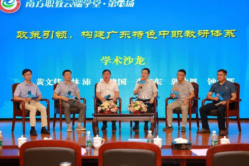 活动最后广东省教育研究院副院长李海东、中山市火炬科学技术学校党委书记陈建国、汕头市教师发展中心高级讲师林沛、清远市教师发展中心科研部副主任郭达恩、韶关市中等职业技术学校教务科长钟良辉等五位来自省、市、校不同领域的中职教研专家,围绕“政策引领,构建广东特色中职教研体系”这一主题开展学术沙龙,就如何建成富有广东特色、上下联动、多元参与、数字赋能的中职教研体系进行了交流研讨。
