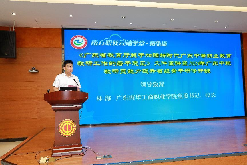 学校党委书记、校长林海出席活动并致辞,他表示本次研修活动恰逢广东大力宣传落实《广东省教育厅关于加强新时代广东中等职业教育教研工作的若干意见》(以下简称《意见》)之际,具有重要意义和现实价值。他代表学校对省教育研究院的高度信任表示衷心的感谢,对各位领导、专家和全省115名优秀教研员的到来表示最热烈的欢迎。他指出举办我省中职教研员能力提升骨干研修班,是贯彻落实党的二十届三中全会精神和构建现代职业教育体系的务实行动,对全面推进我省中职教育高质量的发展具有重要意义。学校高度重视研修承办工作,将集全校优质资源进一步落实落细本次研修的部署与要求,就研修过程进行更加周密的筹划与安排,以高标准、高水平、高质量为大家提供良好的学习环境和管理服务,不辜负省教研院的高度信任。