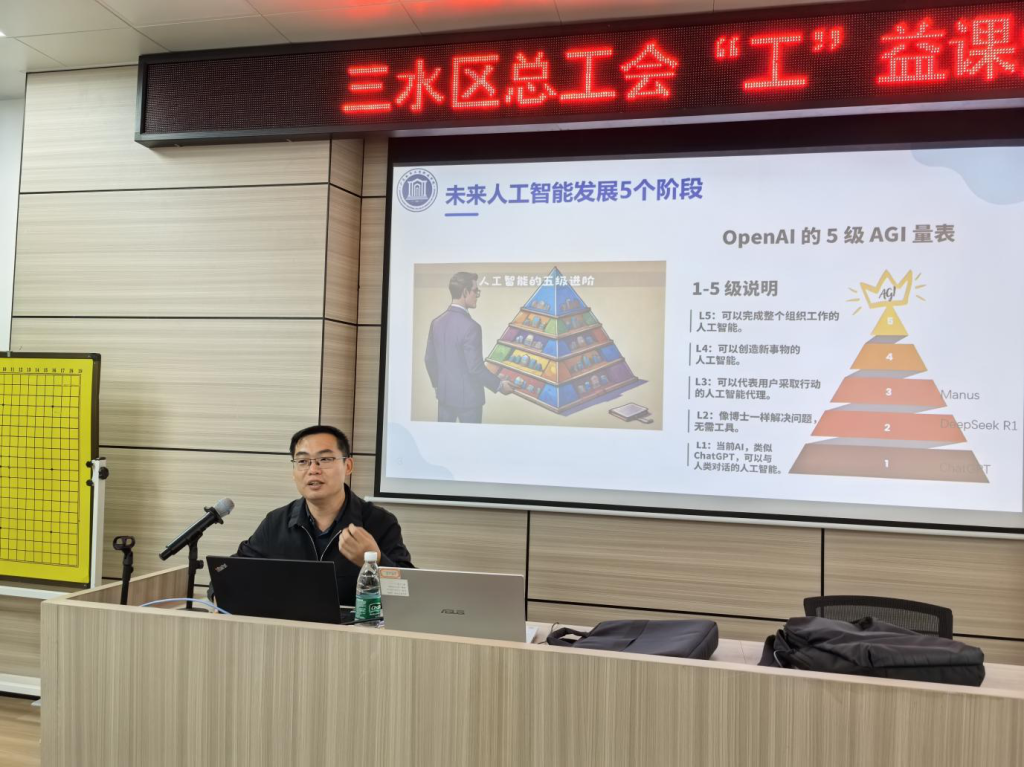 10 月 23 日,佛山三水工人文化宫热闹非凡,由广东工匠学院主办的 “三送五教” 系列讲座在此顺利开讲。来自广东南华工商职业学院的徐永冰讲师带来 “基层职工高效办公 DeepSeek 工具实战培训”,为近50名来自三水制造业、服务业等领域的基层职工送上 AI 时代的技能 “大餐”,这也是广东工匠学院深化产业工人队伍建设改革、服务区域经济发展的又一务实举措。
