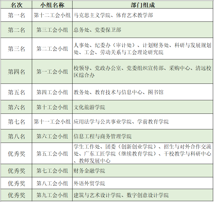 经过两天紧张激烈的赛场角逐,选手们配合默契,充分展现了昂扬向上、奋勇拼搏的精神面貌,赛出了团结、赛出了友谊、赛出了成绩。第十二工会小组(马克思主义学院、体艺部)获冠军,第三工会小组(总务处、保卫处)获亚军,第二工会小组(人事处、纪委办、财务处、科研处、工会、劳研院)获季军。学校副校长唐晓林,纪委书记黄一梅,党委委员、信息工程与商务管理学院院长李新为获奖选手颁奖。