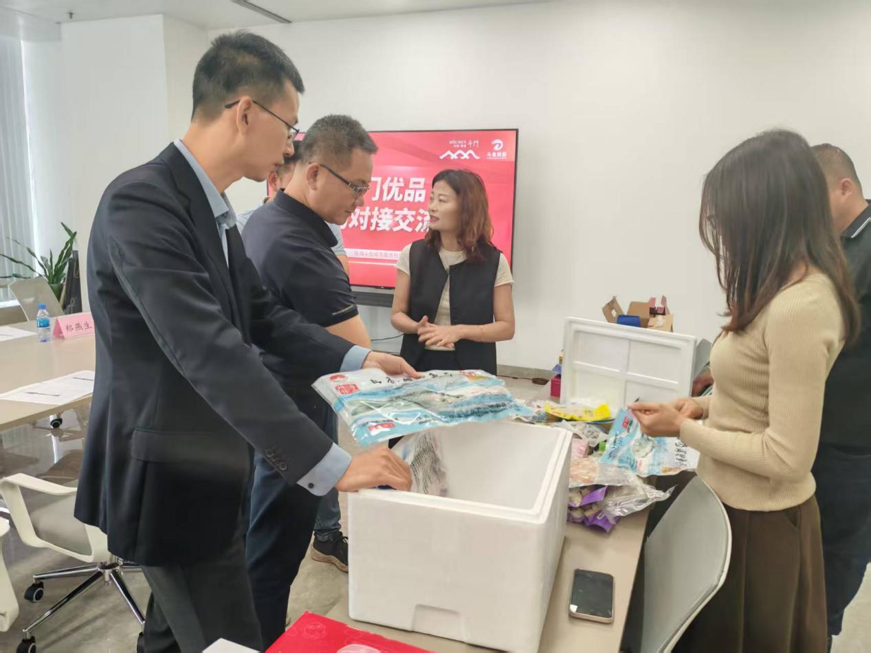 在斗门金城服公司,调研团队认真听取了林颖欣经理关于白蕉海鲈鱼、鲈鱼饼等特色农产品的详细介绍,观看了现场展示的产品实物,双方就产品推广、集中采购等帮扶事项展开了深入探讨。