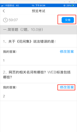 8、答题结束,选择“复查交卷“,检查无误后可选择交卷,若存在问题,可修改答案后再提交。交卷结束答题以”交卷”按钮为准