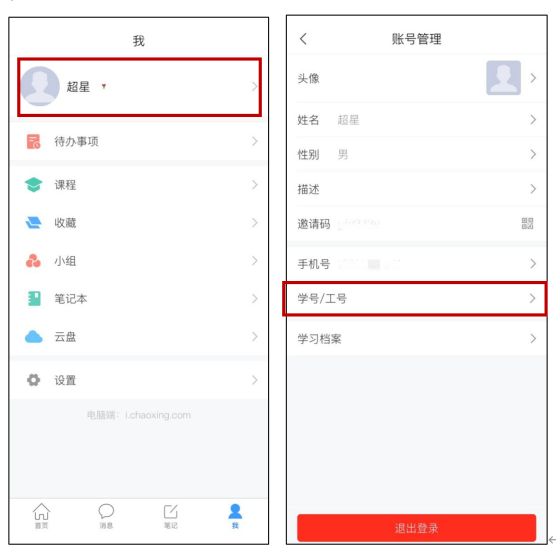 点击头像,进入账号管理界面,然后点击学号/工号,输入学校名称(广东南华工商职业学院或者直接输入2176)及工号/学号即可绑定工号/学号。
