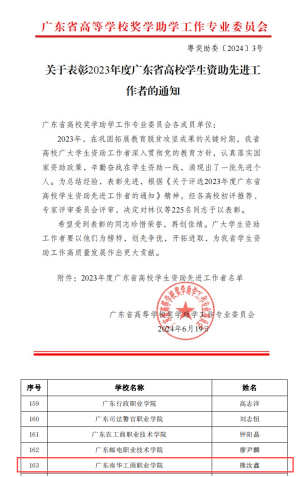 近日,广东省高等学校奖学助学工作专业委员会发布了《关于表彰2023年度广东省高校学生资助先进工作者的通知》([2024]3号),我校教师熊汝鑫荣获“2023年度广东省高校学生资助先进工作者”称号,特此祝贺!