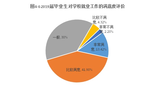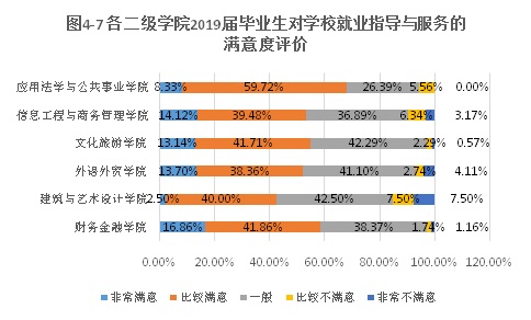 为衡量毕业生就业指导与服务工作的质量,学校在2019届毕业生就业质量问卷调查中设立了满意度调查。结果[1]显示,93.40%的受访者感到满意,其中“非常满意”占13.42%,“比较满意”占41.98%,“一般满意”占38.00%;文化旅游学院、财务金融学院、应用法学与公共事业学院的毕业生的满意度比较高,具体情况如图4-6、图4-7所示。