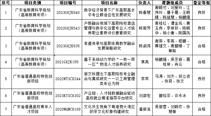 近日,经广东省教育科学规划领导小组及广东省教育厅结项评审会议评审鉴定,我校4项教育科学规划项目、2项特色创新项目及1项青年人才项目顺利结项,特此祝贺!