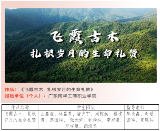文化旅游学院选送的《飞霞古木:扎根岁月的生命礼赞》视频作品脱颖而出,荣获二等奖。作品以独特的视角展现了清远飞霞山古木的文化内涵和生态价值,充分体现了我校师生扎实的专业素养和创新能力。