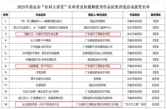 6月13日,我校师生在清远市委宣传部、清远市社科联主办的2025年清远市“社科大讲堂”社科普及短视频优秀作品征集评选大赛中获二等奖1项,三等奖1项,优秀奖1项,获奖数量与等级在省职教城所有高校中位列第一。