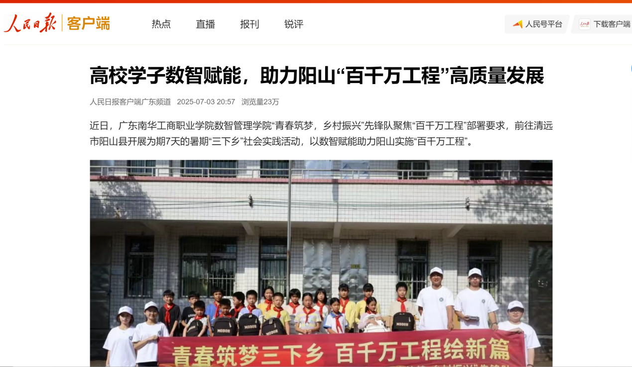 近日,数智管理学院在“人民日报客户端广东频道”发表的一篇《高校学子数智赋能,助力阳山“百千万工程”高质量发展》,让学校暑期“百千万工程”社会实践活动在全网火速出圈。