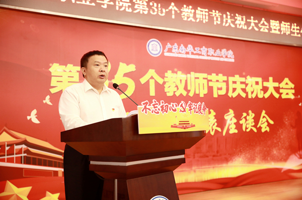 学校党委书记、校长马栩生代表学校党委向默默耕耘在教学、行政一线的全体教职员工,向为学校做出重要贡献的离退休教师、同志们致以节日的祝福,向关心支持学校发展的各级领导、历届校友和社会各界人士致以衷心的感谢!他指出,近年来,学校在改革发展、内涵建设上实现了重大突破。基础设施的建设、校园环境的提升以及服务体系全面改善,办学规模和社会声誉逐步提升。在举国上下喜迎新中国成立70周年的日子里,我们在这里召开教师节庆祝大会暨师生代表座谈会,就是要唱响大力推动高职教育发展的旋律,激励全体教职工不忘初心、牢记使命、奋发作为,着力推动形成弘扬尊重知识、尊重教师的良好社会风尚。他代表学校党委对全校教师寄予如下三点希望:一是坚定理想信念,坚持立德树人;二是加强品德修养,恪守职业道德;三是夯实教学能力,牢记教学使命。