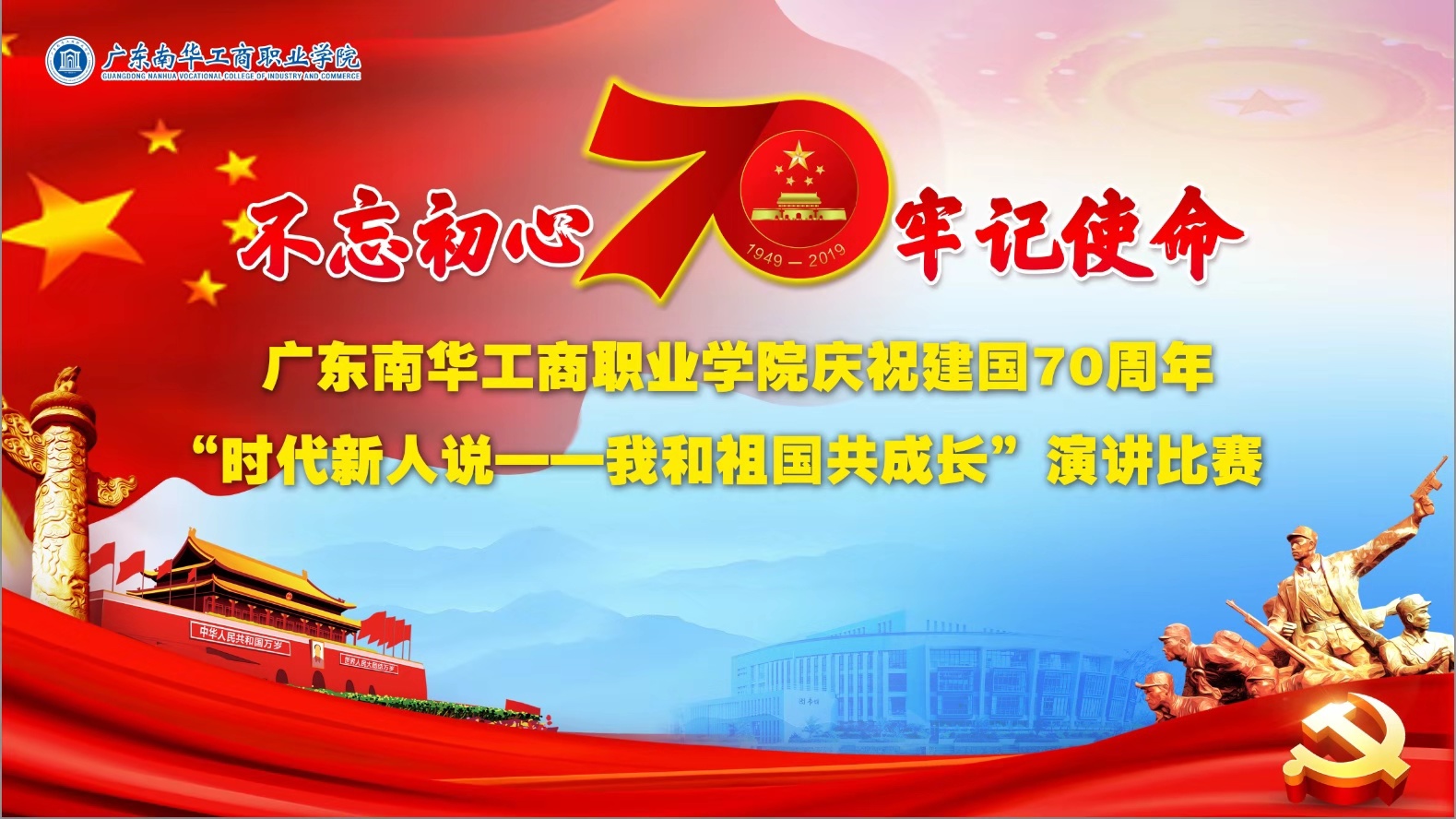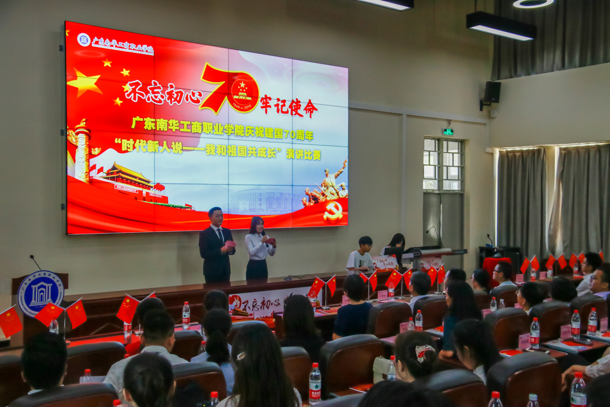 金秋的祖国大地,喜气洋洋;金秋的南华,书声琅琅,弦歌悠扬!9月27日,在新中国七十华诞来临之际,我们迎来了广东南华工商职业学院“追梦新时代,阔步新征程”“十个一”系列活动之“时代新人说——我和祖国共成长”演讲比赛总决赛,南华师生用最真挚的情感、饱含深情的语言凝聚青春力量,来赞美祖国、歌颂祖国,为我们伟大祖国70岁生日献上最美的祝福。学校党委书记、校长马栩生,学校副校长王满元,学校副校长唐晓林出席活动,学校各职能部门负责人、各二级学院领导、师生代表140余人到场观看了比赛,本次比赛还进行了三校区网络直播,吸引了三校区师生在线收看。