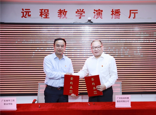 创显科教董事长秘书邵维林为调研团做《打造国际智慧教育产业创新高地》报告,总经理张皓代表广州创显科教股份有限公司与我校签订《产学研合作协议书》,双方协定将发挥各自优势,通过多形式、多层次的科学技术交流与合作,在创新创业人才培养、专业教学实训提升,工程研发中心共建、职教专业文化建设、职教师资培训等相关领域,共同构建产学研联盟的新体系,建立产学研长期合作关系,共同推进企业与高等院校的全面技术合作。