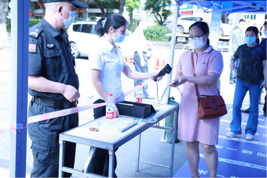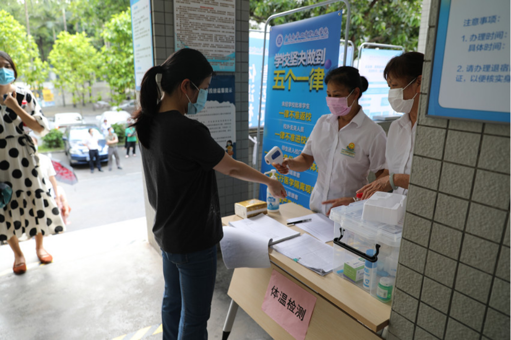 学生进入宿舍收拾行李,宿管提醒同学一米间隔排队,测量体温,提醒出示学生证或身份证,查验名单,确认是否属于返校学生后,登记姓名、房号、体温。