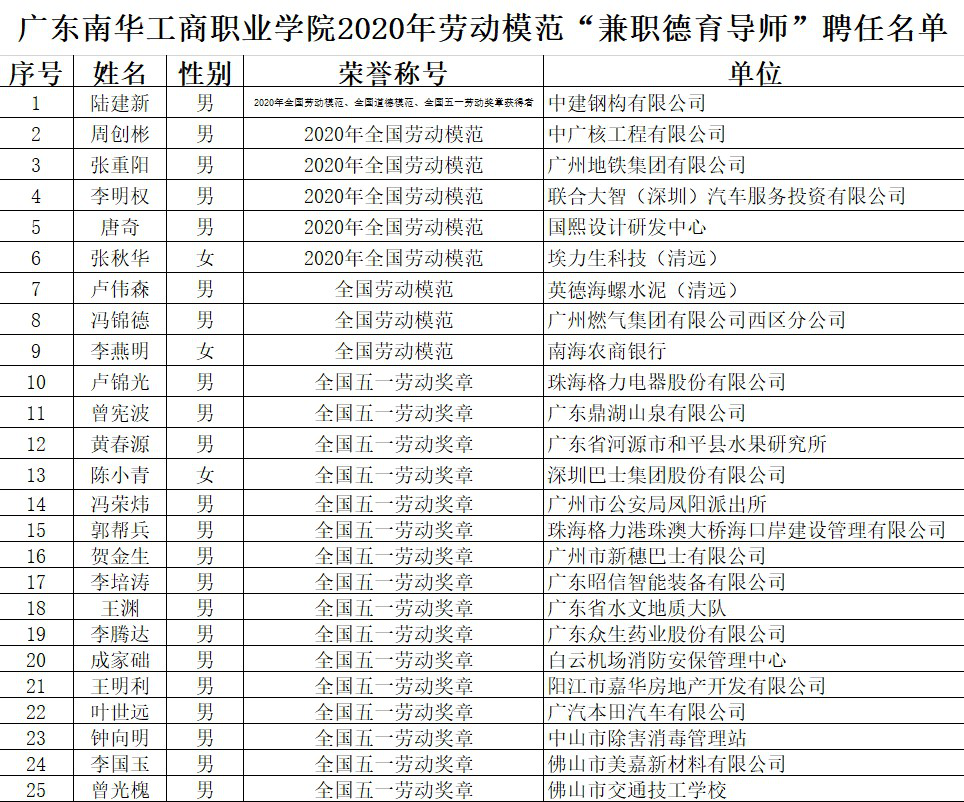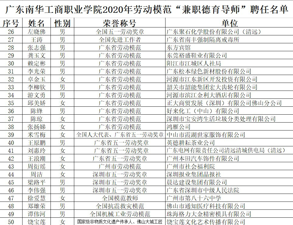 活动第二部分是集中聘任,陆建新、2020年全国劳动模范周创彬、张重阳、李明权、唐奇、张秋华,全国人大代表、广东省劳动模范米雪梅等50名国家、省、市劳动模范代表获聘“兼职德育导师”。此次我校举行劳动模范“兼职德育导师”集中聘任大会是国内高职院校首次大规模集中聘任劳动模范。为成功举办此次劳动模范“兼职德育导师”集中聘任大会,我校前期召开了多次筹备会、研讨会和劳模工匠座谈会,倾听全国、省级、市级劳动模范和全国先进工作者的意见和建议,对聘任人选和规章制度进行深入分析和研究,目前已出台了《广东南华工商职业学院关于聘请劳模代表担任德育兼职导师的实施方案》。
