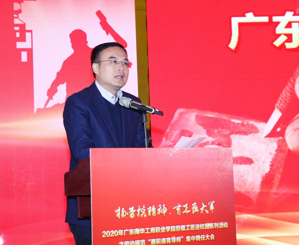 12月19日,学校在清远校区召开2020年劳动模范“兼职德育导师”集中聘任大会暨“劳模工匠进校园系列活动”启动仪式,首聘50名全国劳动模范、五一劳动奖章获得者作为 “兼职德育导师”。广东省总工会党组成员、副主席李和森,省总工会组织部长严壁、经济工作部部长张祖耀,省职教城事务中心副主任温秀媚、清远市总工会副主席曲爱军,学校领导马栩生、韦秀华、唐晓林、严新、王荣光出席启动活动。