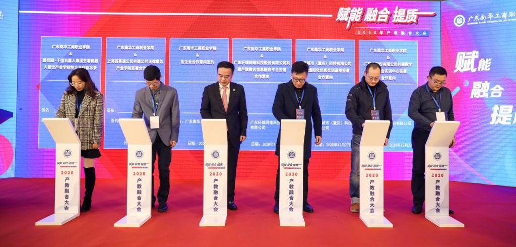大会第四环节,是系列合作意向签约。按照合作意向,学校将与广东碧有味餐饮有限公司开展创业实训基地建设公益项目,建设机器人餐饮产业学院,与上海百事通公共法律服务有限公司共建公共法律服务产业学院,与广东轩辕网络科技股份有限公司共建产教融合信息服务平台,与光辉城市(重庆)科技有限公司共建虚拟化仿真实训基地,与广联达股份有限公司共建数字建筑综合实训中心。